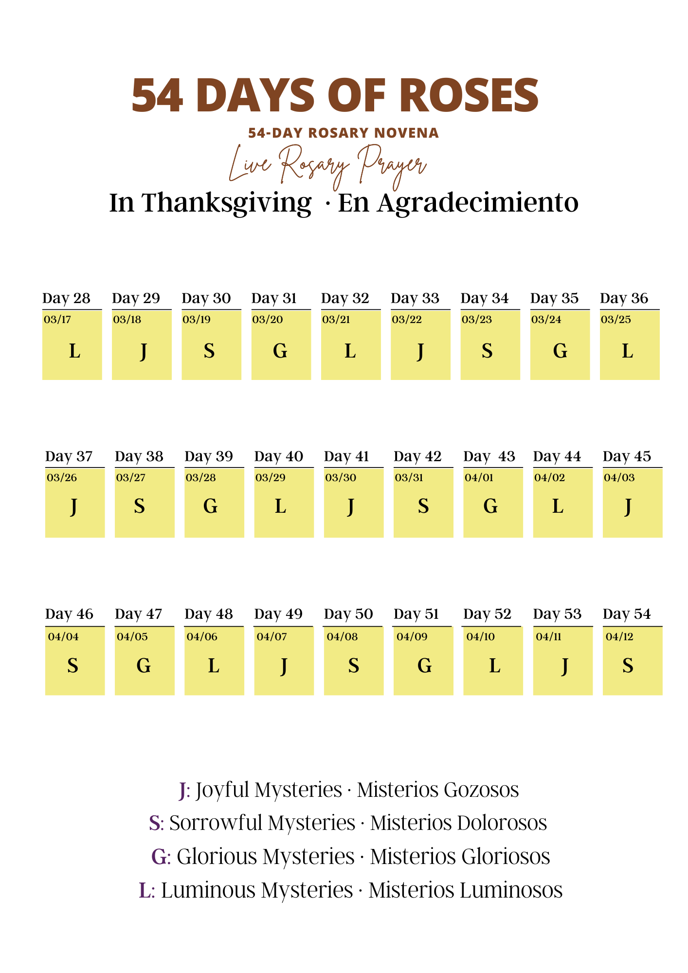 After that, you repeat the cycle starting again with the Joyful Mysteries and continuing throughout the entire 54 days of the Novena. See chart below.