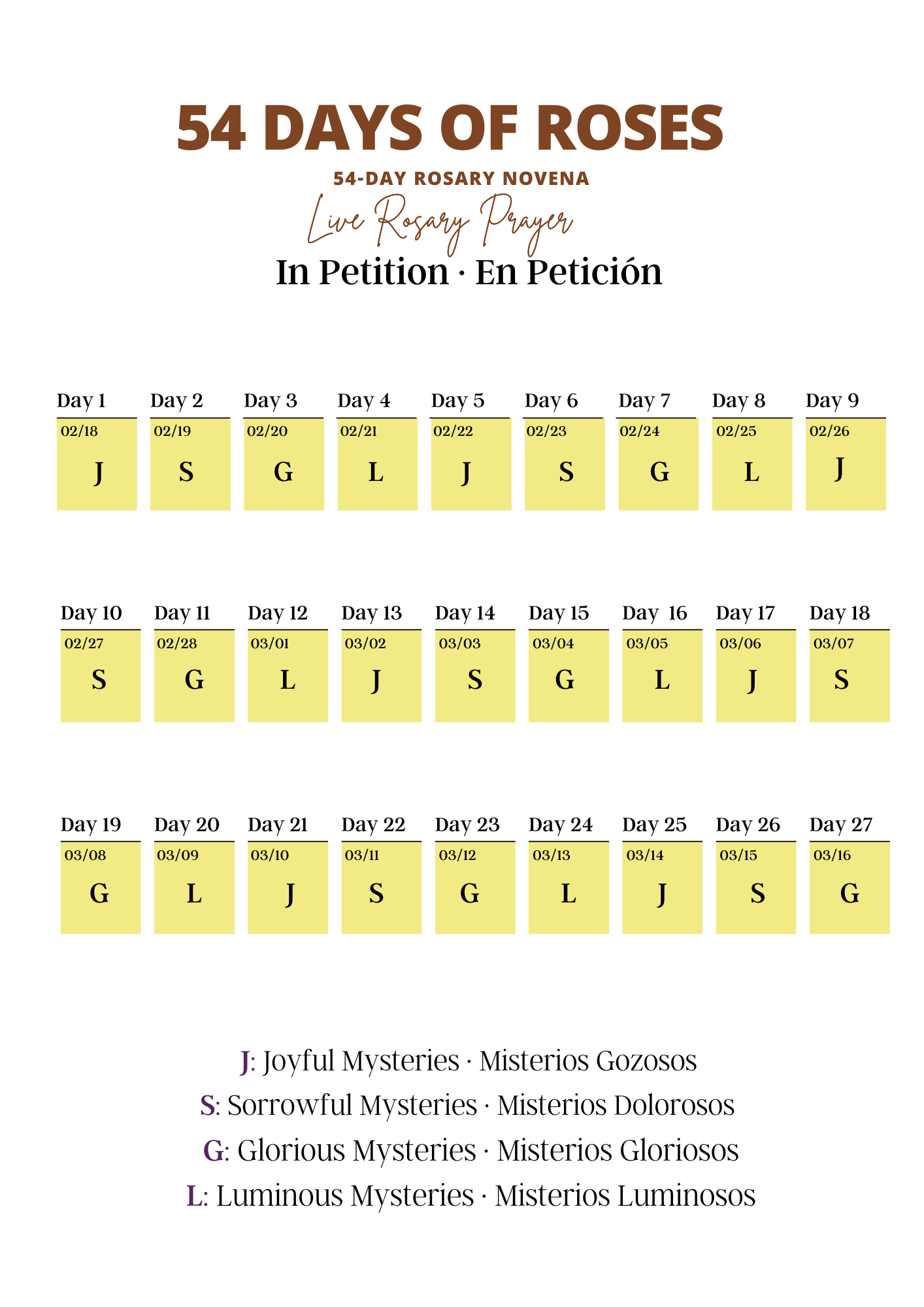 We will pray the rosary for 54 consecutive days, without missing a single day. The Novena is divided into two parts: the first 27 days are prayed in petition, and the following 27 days are prayed in thanksgiving.